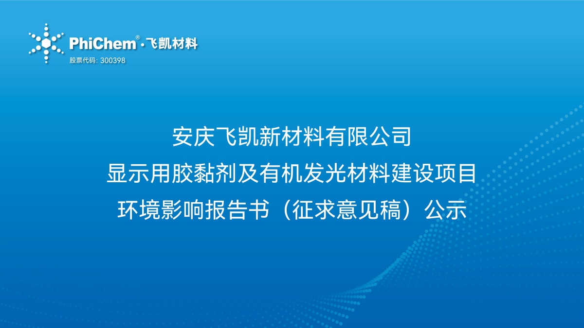 目前《安庆飞凯新材料有限公司显示用胶黏剂及有机发光材料建设项目环境影响报告书》(征求意见稿)已形成,建设单位现将征求意见稿进行公示,并征求公众意见。
